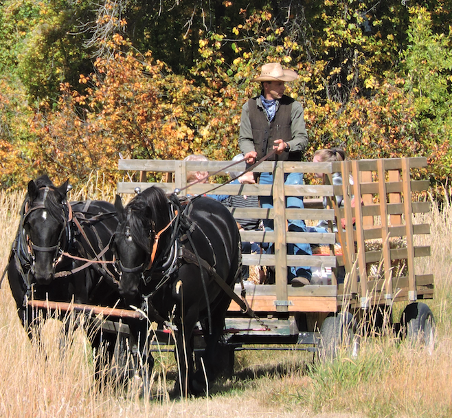 Fall colors, crisp air, and the smell of horses set the stage for a classic autumn hay ride. Join one of our horse-drawn hay rides through the fields, along the river, and back to the barn aboard our horse-drawn wagon, which seats up to 14 guests.